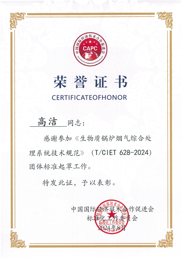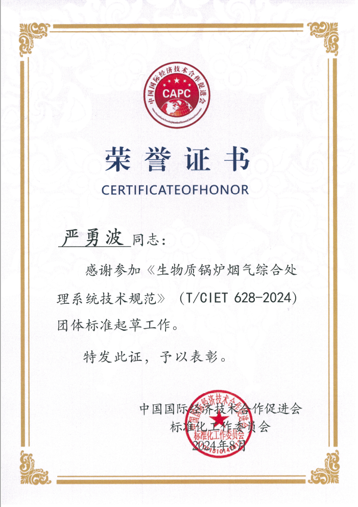 在團(tuán)體標(biāo)準(zhǔn)制定期間,公司董事長高潔女士、公司總工嚴(yán)勇波先生共同參與了《生物質(zhì)鍋爐煙氣綜合處理系統(tǒng)技術(shù)要求》(標(biāo)準(zhǔn)號:T/CIET 628-2024)的前期討論和最終起草。