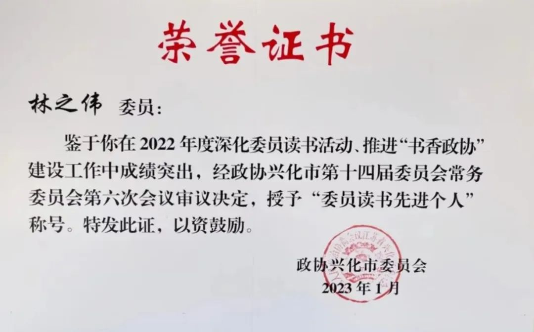 興化市政協(xié)組織和全體政協(xié)委員堅(jiān)持以習(xí)近平新時(shí)代中國(guó)特色社會(huì)主義思想為指導(dǎo),深入學(xué)習(xí)宣傳貫徹黨的二十大精神,為表彰先進(jìn),政協(xié)興化市委員會(huì)授予20名同志“委員讀書(shū)先進(jìn)個(gè)人”榮譽(yù)稱號(hào),我司運(yùn)行總監(jiān)林子偉憑借在深化委員讀書(shū)活動(dòng)、推進(jìn)“書(shū)香政協(xié)”建設(shè)工作中的突出表現(xiàn)躋身其中。