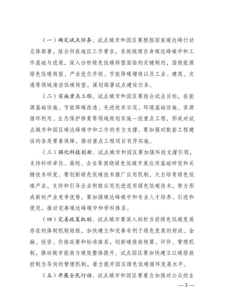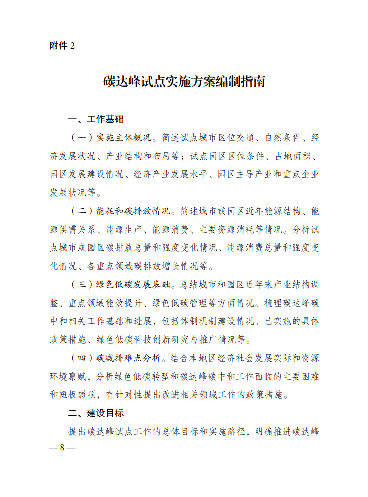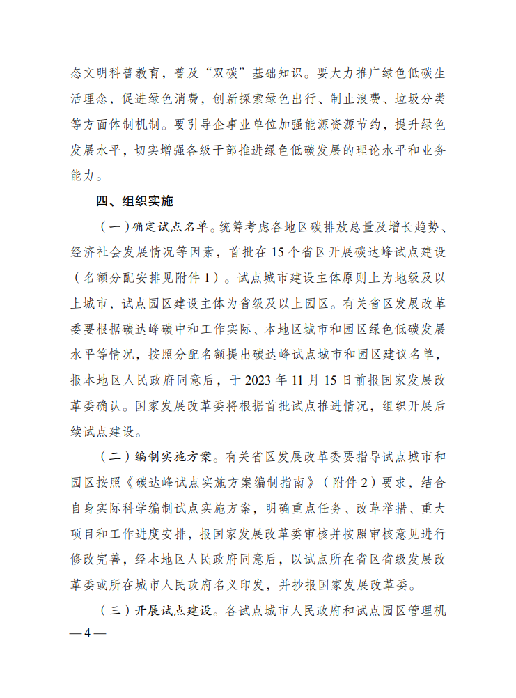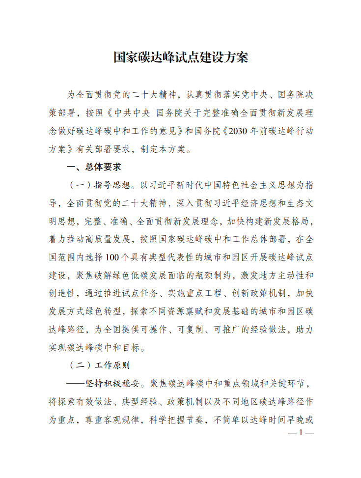 2023年10月20日,國家發(fā)改委印發(fā)《國家碳達峰試點建設(shè)方案》?!斗桨浮诽岢觯?strong style="box-sizing: border-box;">在全國范圍內(nèi)選擇 100 個具有典型代表性的城市和園區(qū)開展碳達峰試點建設(shè),聚焦破解綠色低碳發(fā)展面臨的瓶頸制約,激發(fā)地方主動性和創(chuàng)造性。首批國家碳達峰試點名額已安排35個,涉及省份包括河北、山西、內(nèi)蒙古、遼寧、黑龍江、江蘇、浙江、安徽、山東、河南、湖北、湖南、廣東、陜西、新疆。